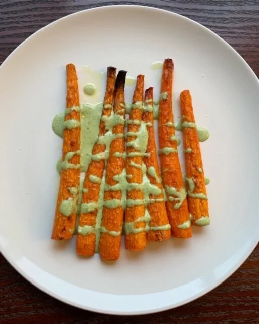 Farro risotto for dinner! Farro is my favorite grain (used Bob’s Red Mill tonight and it was so chewy and delicious — I typically use a quick-cooking 10-minute kind, and this was noticeably heartier, in a good way!) — and it is especially good when simmered in chicken broth infused with garlic, red pepper flakes, oil and butter, thyme, and lemon zest. This risotto also has shredded zucchini, kale, lemon juice, parm, and fresh mozz cheese that I stirred in at the very end to melt. SO GOOD! On the side: roasted carrots drizzled with cilantro sauce leftover from last night’s samosa wrap dinner.
