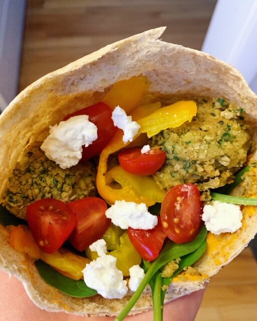 Falafel is a great, healthy meal to make that uses both pantry items (chickpeas, oats, pita bread) and bit and bobs from your fridge that you want to use up (veggies, cheese). Tonight we made them with all the fixin’s: feta, leftover romesco sauce from last night, banana peppers, fresh tomatoes, and spinach.