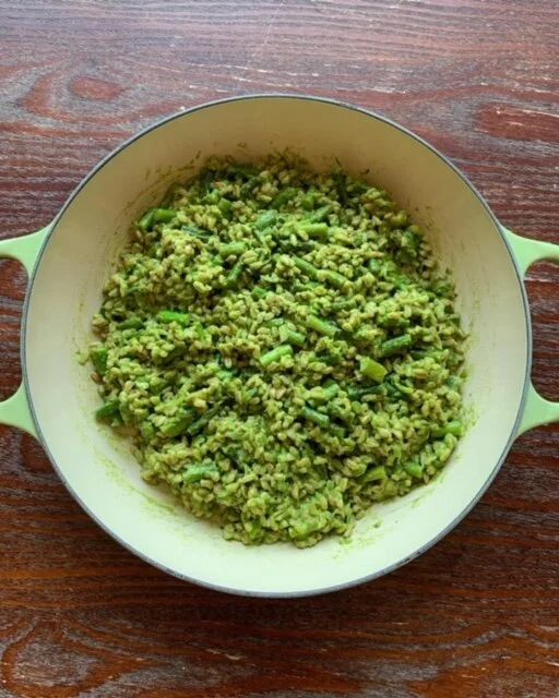 Tonight’s very green dinner: farro, veggies (asparagus + zucchini), and our favorite homemade arugula pesto.