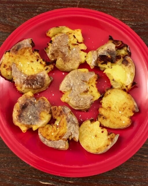 I LOVE POTATOES. This is my current favorite kind: Yukon Golds boiled until soft, smashed flat, then roasted until super crispy on the outside and incredibly fluffy on the inside. Delicious as is, but even better? Dipped into smoky homemade romesco sauce.