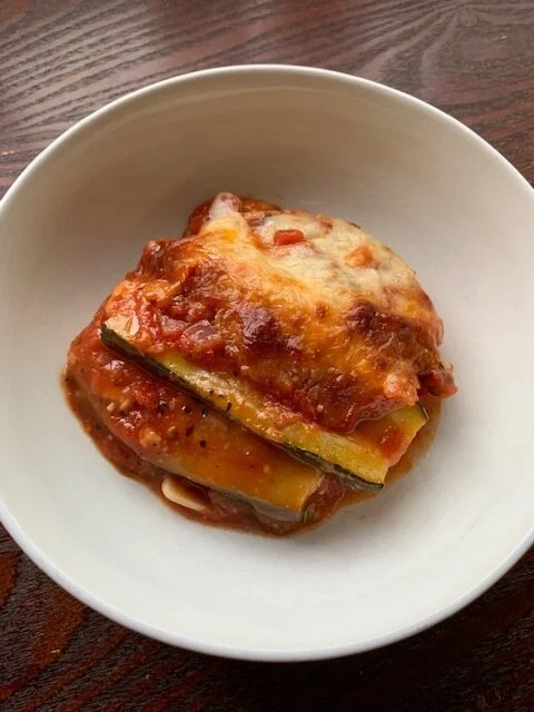 We loved eating this meal by spreading pesto on slices of bread or toast then topping with the zucchini parm. It also makes great leftovers!