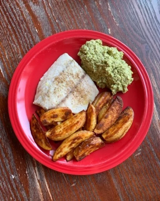 Place two 6 oz filets of white fish on a parchment-lined sheet pan (I used Barramundi sustainable seabass that I found in the frozen section of my Whole Foods, letting it defrost in the fridge overnight). Drizzle with olive oil and season with salt and pepper. When your potato wedges have 15 minutes left to cook (right after you flip them), put the sheet pan with the fish in the oven and roast for 15 minutes alongside the potatoes. Check the fish to see if it’s opaque and flakes easily with a fork; this signals that it is cooked through. (If it’s not done yet, put back in the oven for a few more minutes and check again). Out of the oven, squeeze some fresh lemon juice over the fish.